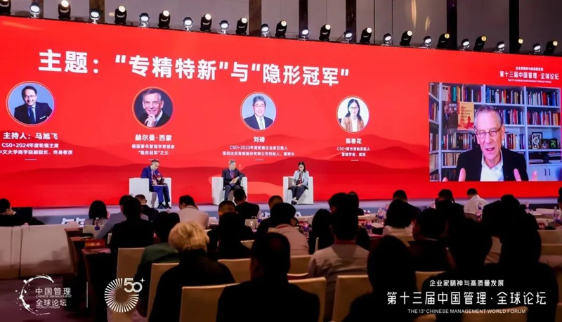 随后,由马旭飞主持,赫尔曼·西蒙、陈春花、刘磅等嘉宾围绕中国“专精特新”和西方“隐形冠军”的异同、如何借鉴西方“隐形冠军”管理理论和运营方法,中国管理模式如何助力中国企业全球崛起等话题展开巅峰对话。赫尔曼·西蒙通过在线的方式参与讨论,全网超过500万人次观看了此次精彩的思想碰撞。