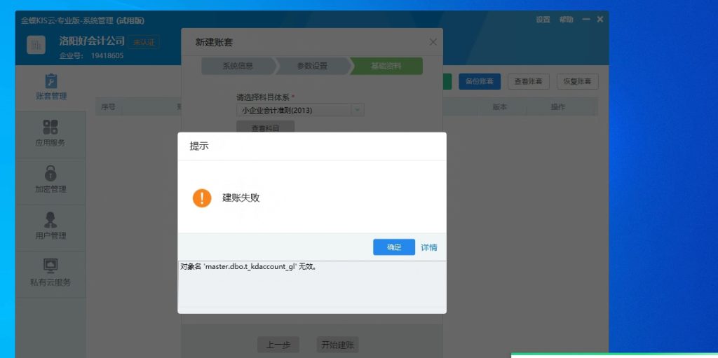 2、删除金蝶软件,重新安装金蝶专业版软件(不使用修复安装),重启电脑后,系统管理显示试用账套。