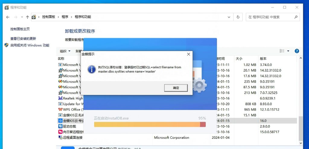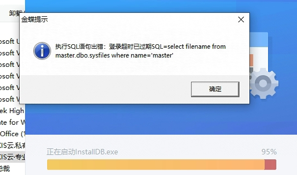 【问题描述】:20240115洛阳金蝶软件客户瑞宝公司安装专业版16.0,win10系统,sql2008r2提示执行Sql语句出错:登录超时已过期,不显示试用账套,新建账套和恢复账套提示报错。
