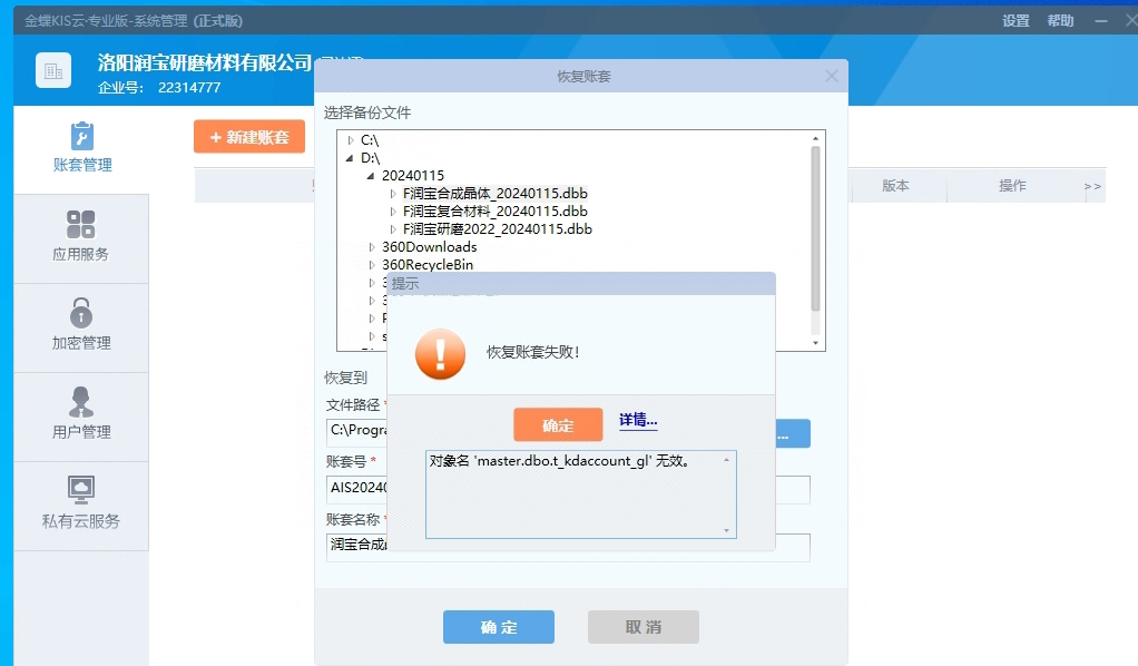 2、删除金蝶软件,重新安装金蝶专业版软件(不使用修复安装),重启电脑后,系统管理显示试用账套。